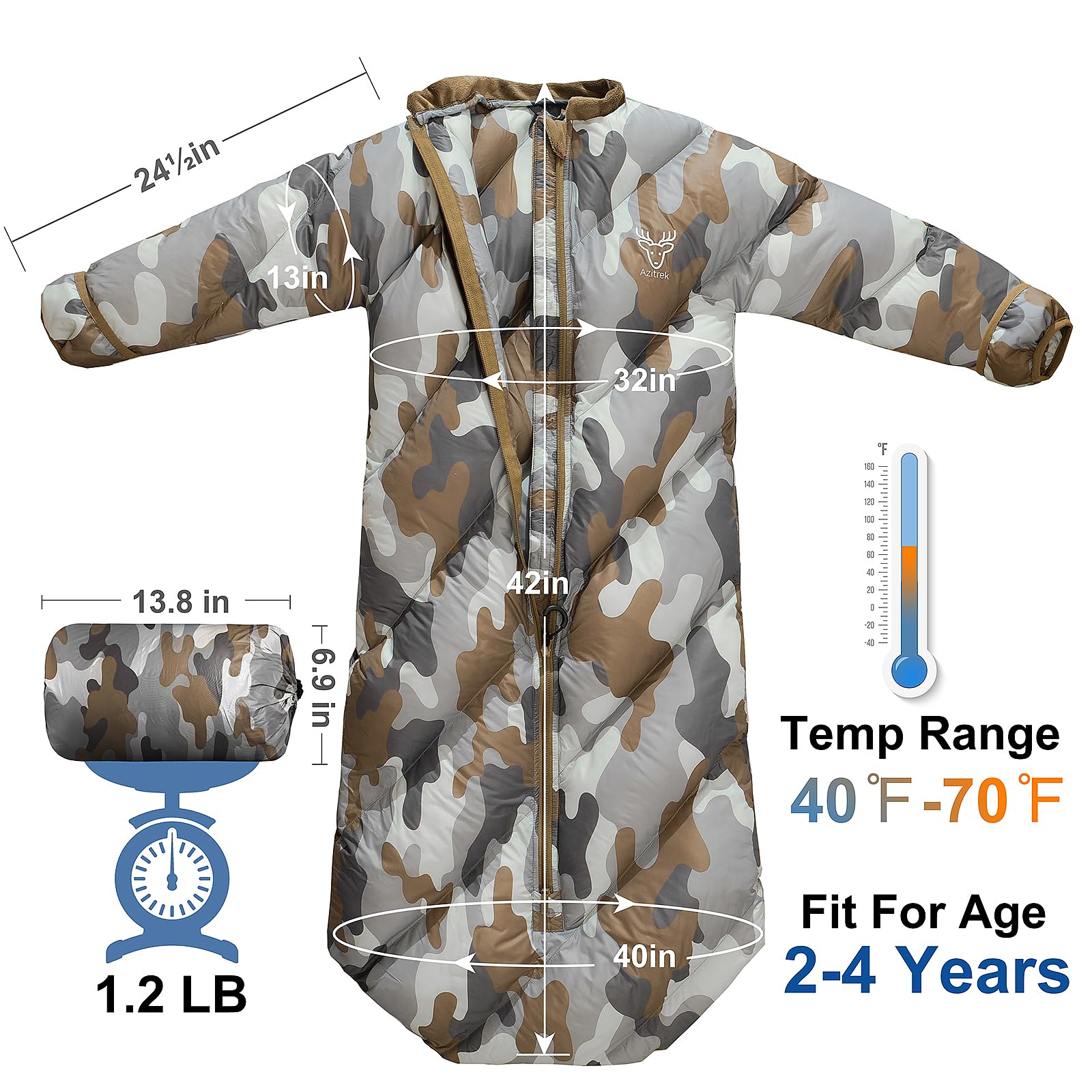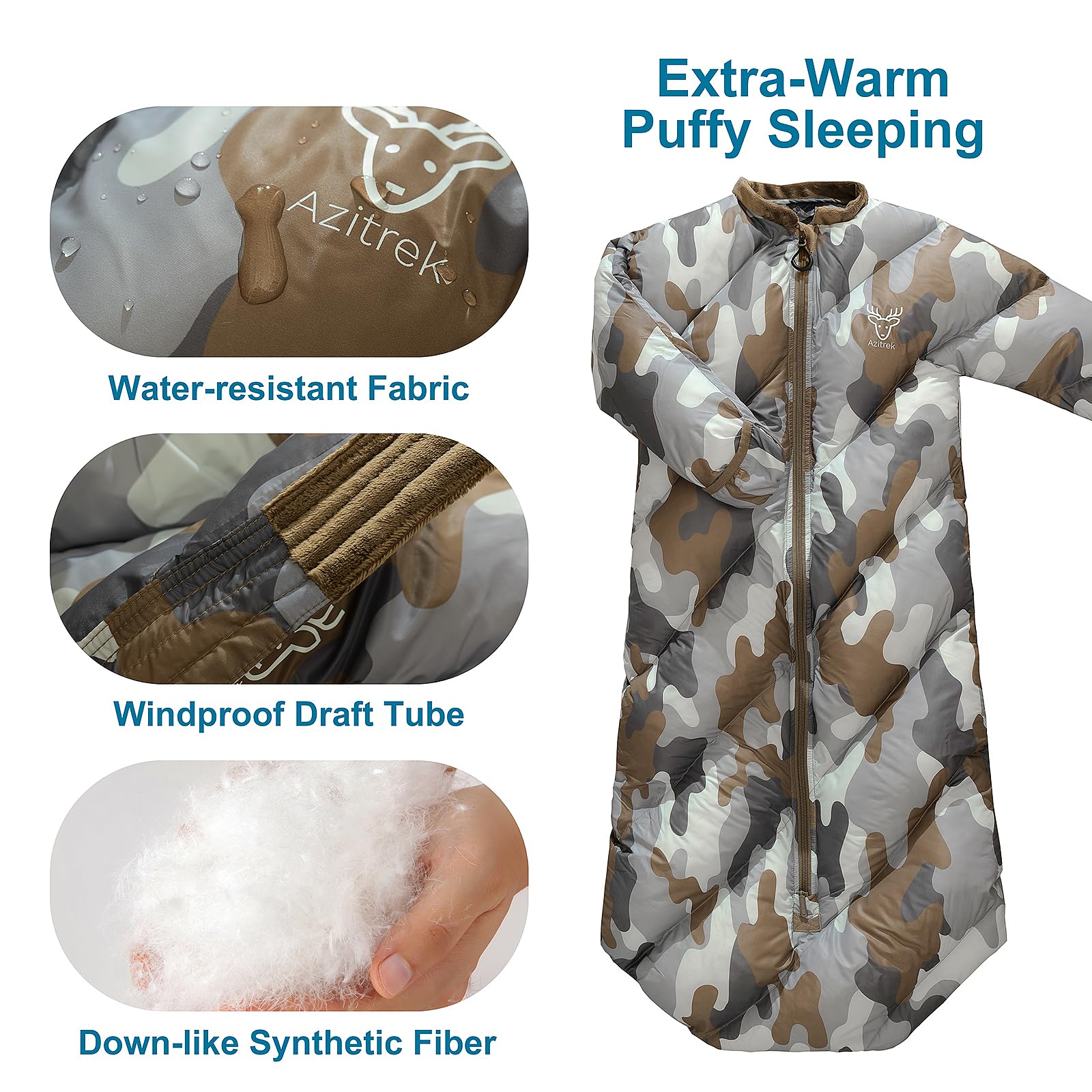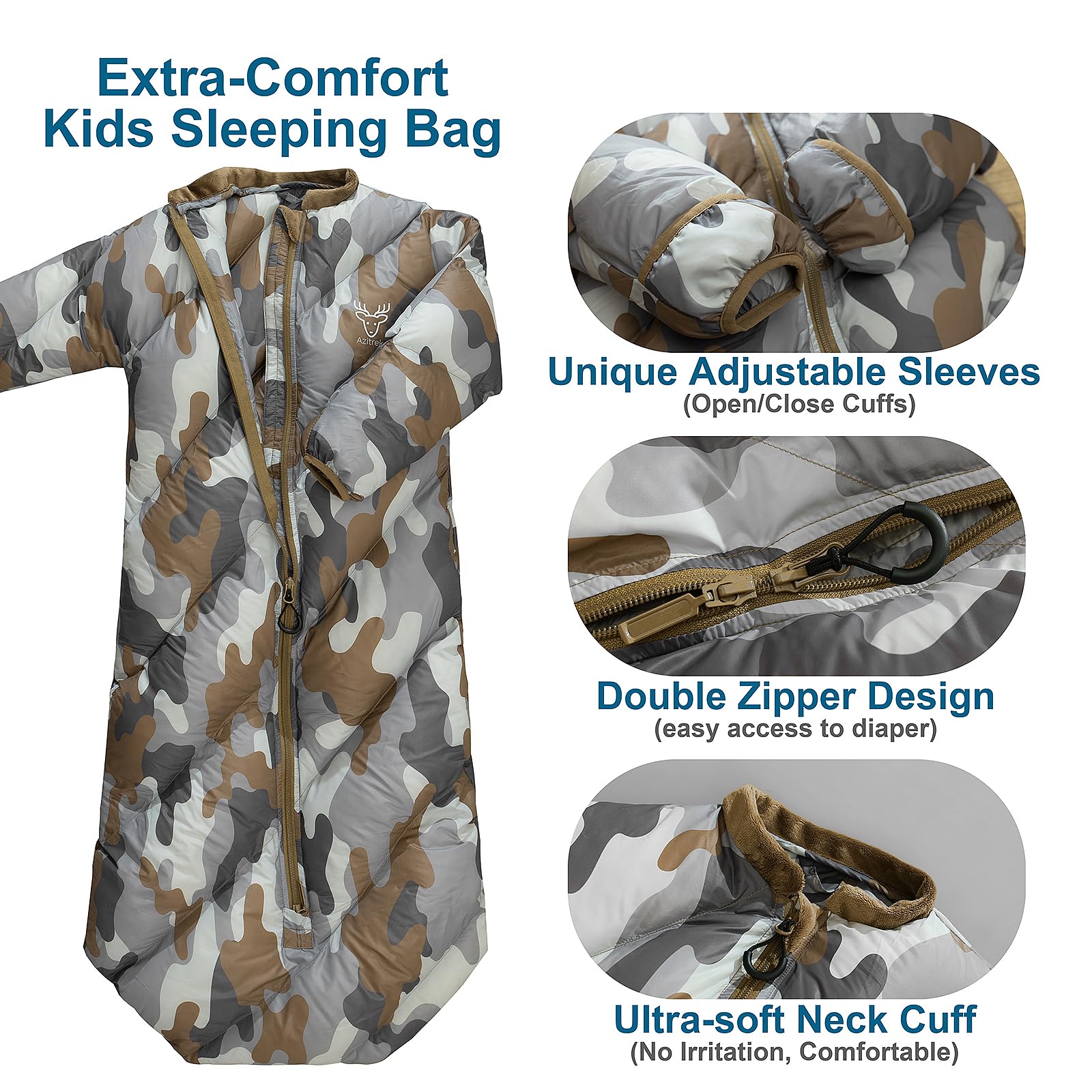 - CUSTOMIZABLE WARMTH & MOBILITY: Designed with unique sleeves featuring adjustable open & close cuffs, plus the draft tube protected 2-way zipper, this sleeping bag offers a personalized warmth experience while remaining hands free and certain mobility, making it perfect for outdoor adventures, or indoor forts and slumber parties.